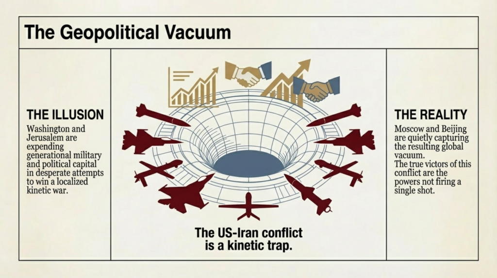 While the U.S. and Iran trade blows, the war’s ultimate trajectory is being steered from the quiet rooms of Moscow and Beijing. This is no longer a regional dispute; it has morphed into a proxy battlefield for global hegemony.