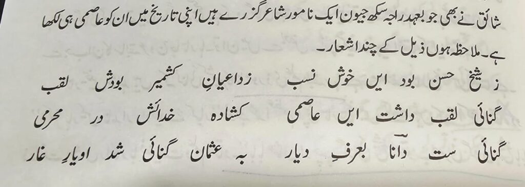 Meaning: Shiekh Hassan ( Shiekh Yaqoob E Sarfi’s Father) is fortunate enough to be from the clan as the respected ones in Kashmir had got this title. Ganaie was the title of Bayazeed Asimi whose title was well justified by his creator among the people. Ganaie were the wise people among the people as the same-titled “ Hazrat Usman(ra) was a companion in the Cave.