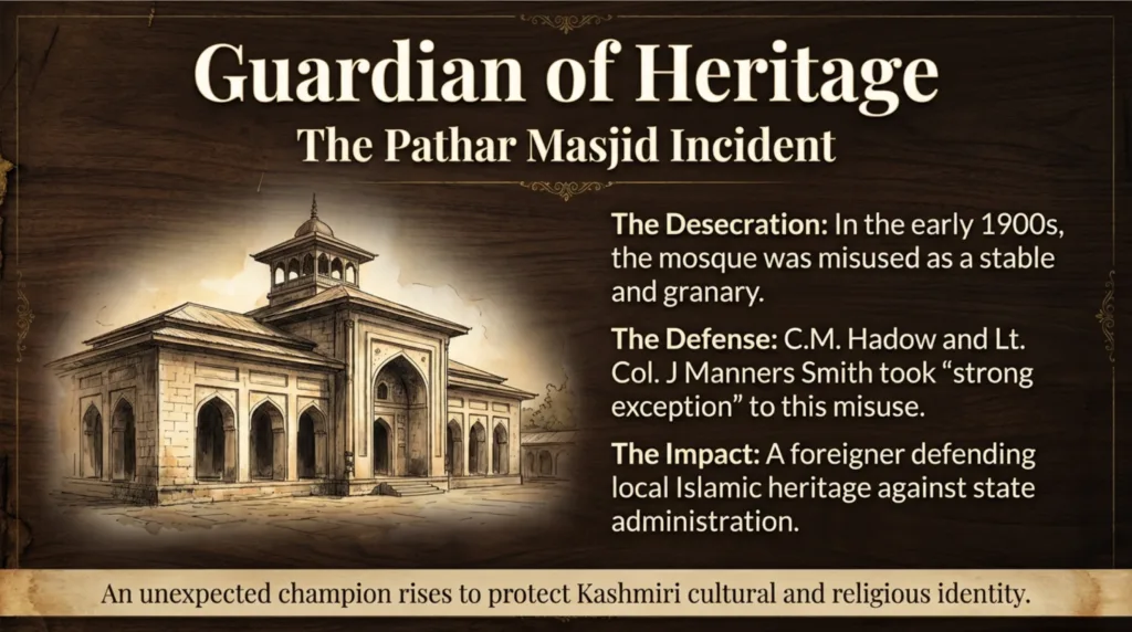 Hadow was also a strong advocate for the preservation of Kashmir’s historic landmarks. In the early 1900s, the famous Pathar Masjid of Srinagar was being used disrespectfully as a horse stable, a state granary, and later an orphanage under the rule of Pratap Singh. Alarmed by this desecration, C.M. Hadow, along with Lt. Col. J Manners Smith, took strong exception to the misuse of the sacred site, demonstrating his deep respect for the local heritage.