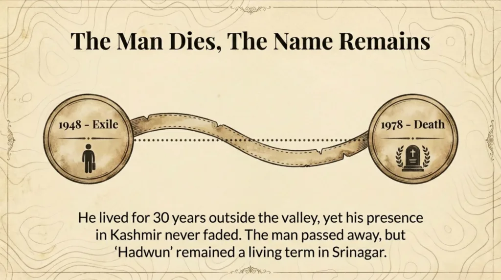 C.M. Hadow was exiled from Kashmir in 1948 and passed away in 1978. Though his life ended far from the valley he had served so well, his impact proved to be permanent.