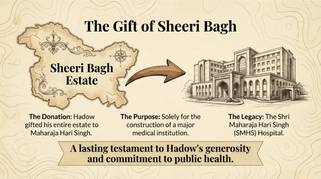- Major Donation: In a landmark act of philanthropy, he donated his entire Sheeri Bagh Estate to Maharaja Hari Singh, providing the land needed for the construction of the Shri Maharaja Hari Singh (SMHS) Hospital.